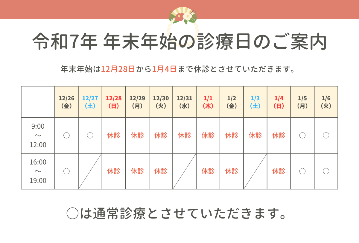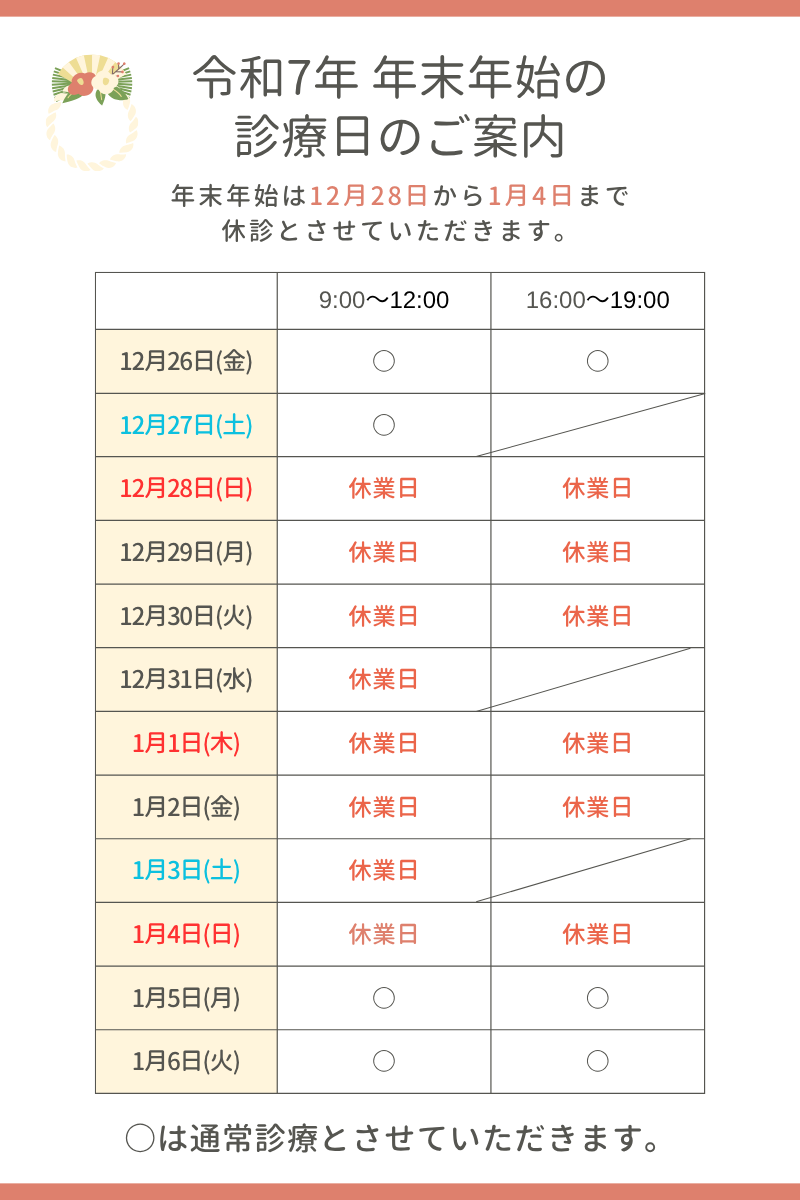 | 12/28(日) 〜1/4(日) | 休診 | |