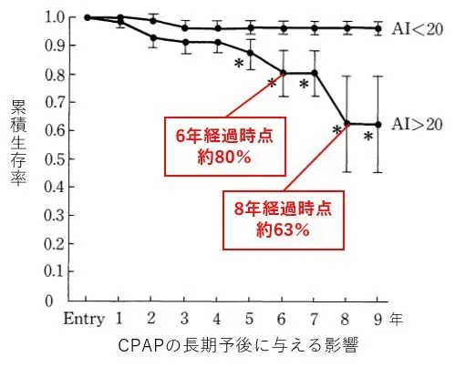 先ほど重篤な睡眠時無呼吸症候群の場合、8年後の死亡率が約37%であるとお伝えしましたが、適切にCPAP治療が行えていると、睡眠時無呼吸のない一般の人と同程度にまで生存率が高まることが報告されています。